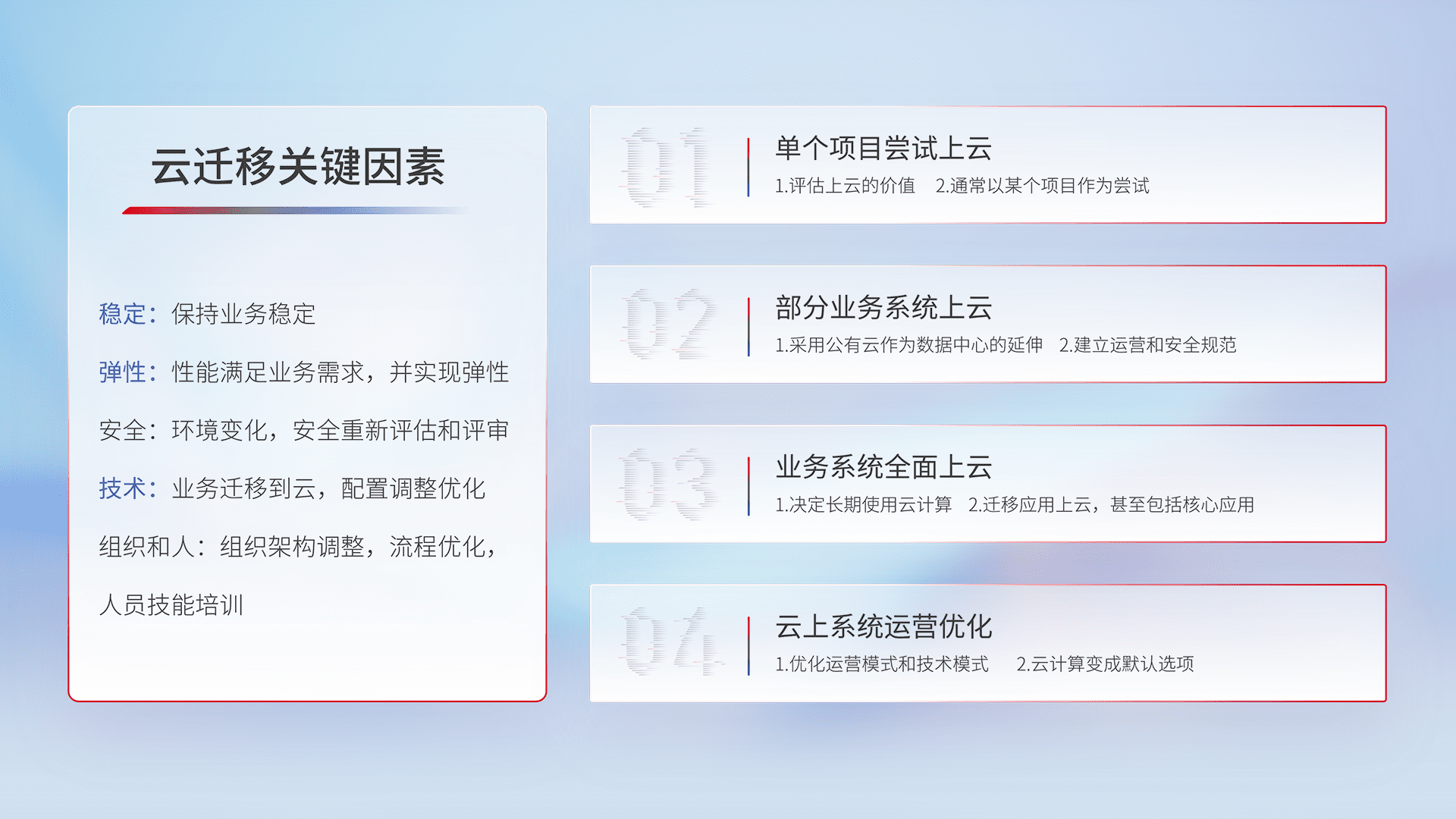 结合实际业务,,,从规划设计、、、云平台选型、、、、云原生改造、、、数据迁移、、集成交付,,,,迁移全过程为客户识别最佳上云路径,,做好风险识别管理,,,,设计网络架构、、、身份权限、、、、安全审计合规、、、、操作审计、、、、日志审计、、监控告警策略、、、多站点容灾设计等,,,对云上基础设施进行整体规划,,,提升IT治理水平,,以满足弹性、、、高可用、、、、高性能的需求。。。